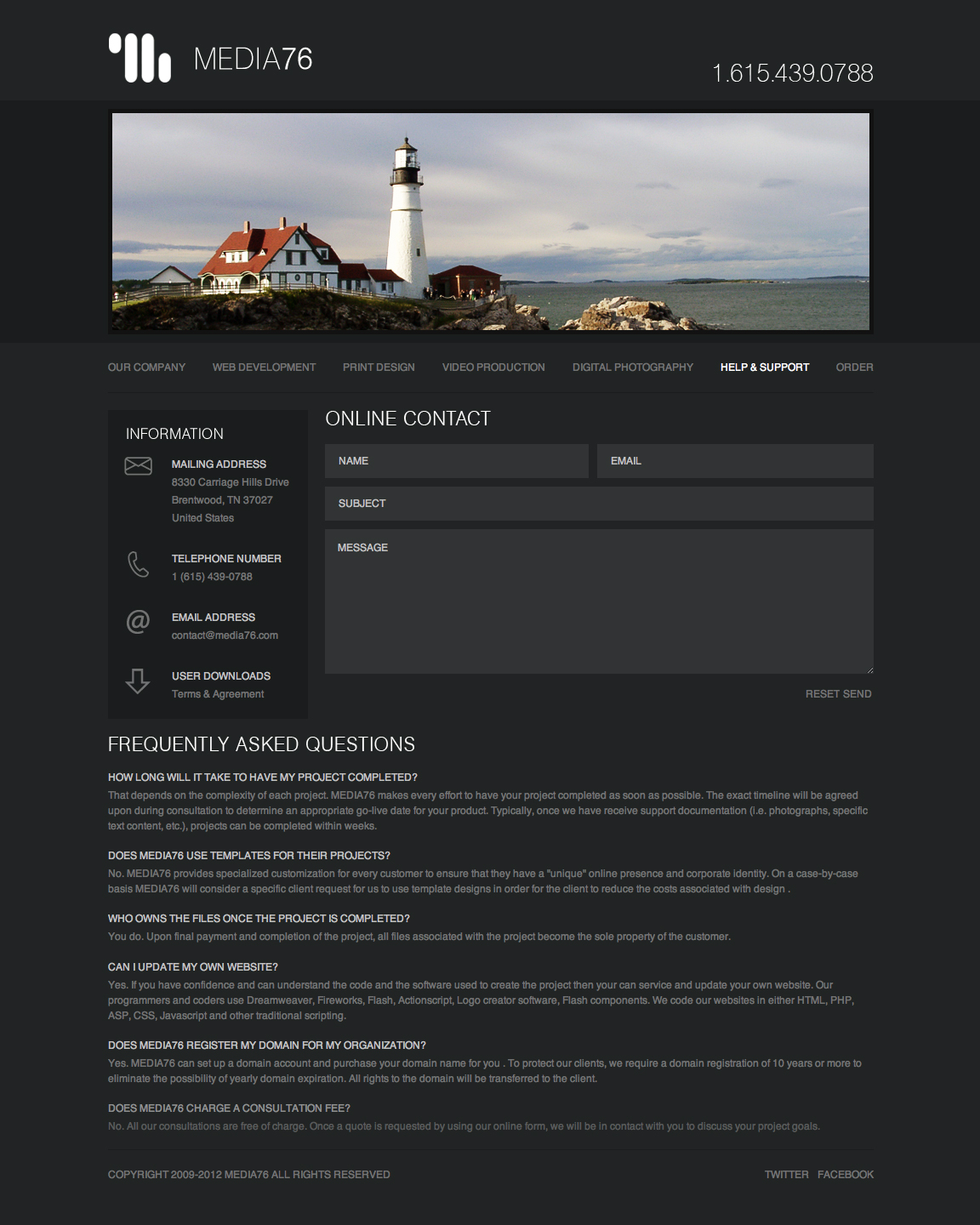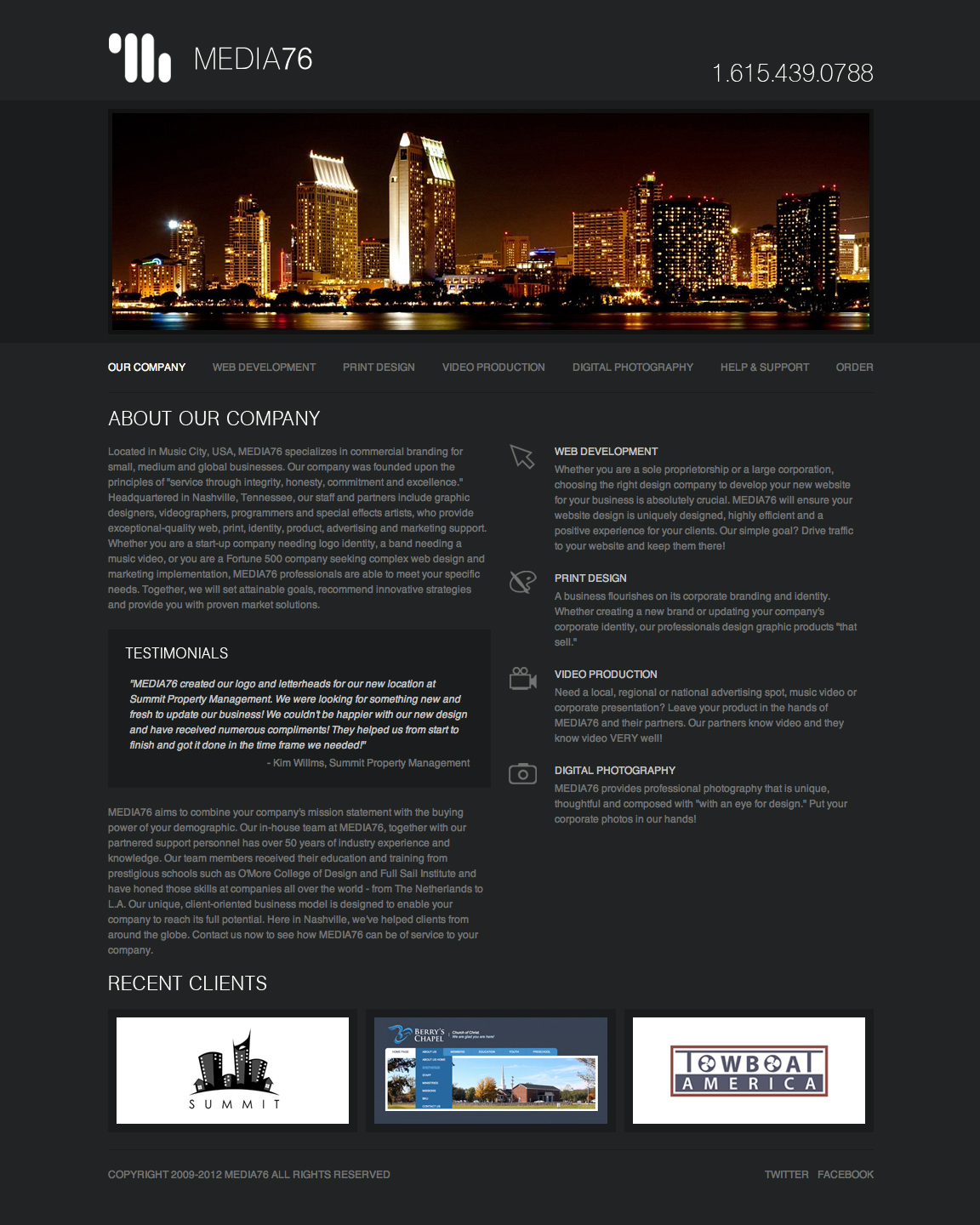 Originally created as a student project, MEDIA76 evolved into a freelance creative studio I co-founded during college with Andrew Wierzba. The goal was to provide thoughtful, full-spectrum creative services across four core disciplines: web development, corporate identity, video production, and digital photography. I designed the visual identity and the company website, which served as both our brand hub and client platform.